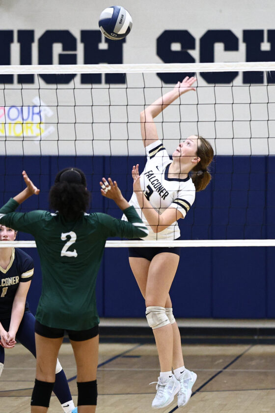 - Falconer’s Mylie Zaranek rises up for a spike during Tuesday’s Section VI Class C prequarterfinal against Tapestry in Falconer. Photo courtesy of Steve Garvey