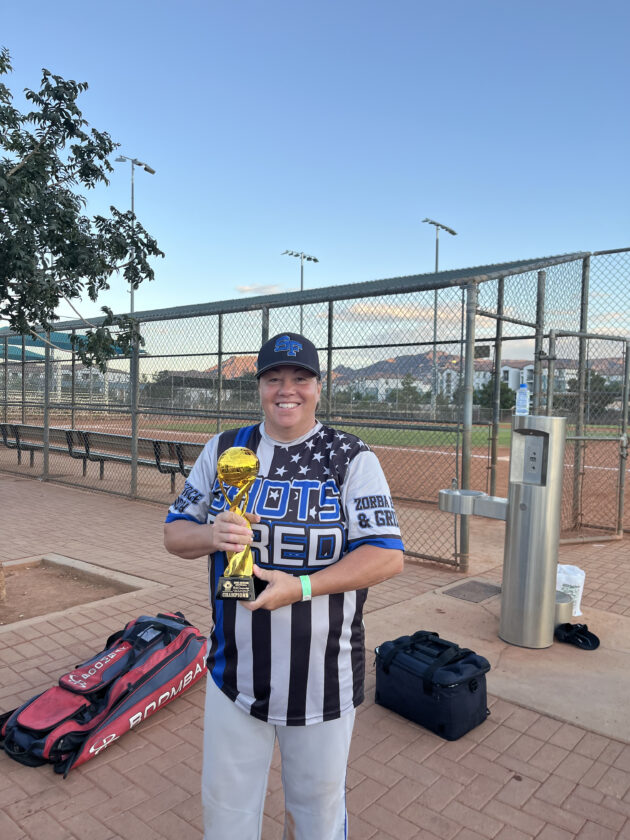 - Jamestown native Lori Franchina is pictured with the championship trophy at the Senior Softball-USA World Championships earlier this month in Las Vegas. Submitted photo