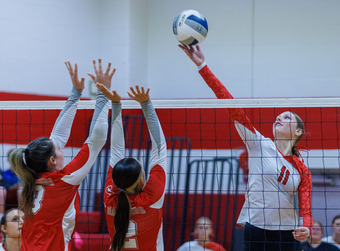 - Randolph’s Addyson Shawley goes for a hit as a pair of Salamanca defenders protect the net in CCAA Division 2 volleyball action on Wednesday. Photo courtesy of Mike Frame
