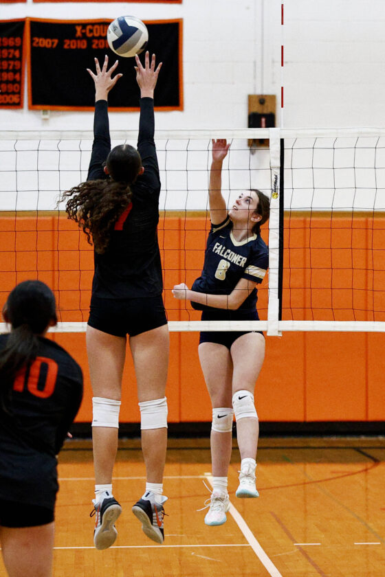 - Fredonia’s Alyse Bugaj attempts to defend a hit by Falconer’s Kaylee Green during Wednesday’s CCAA D1 volleyball at Fredonia High School. Photo courtesy of Steve Garvey