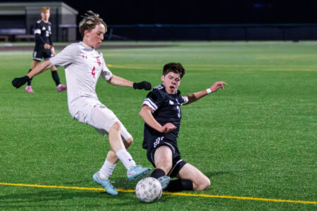 - Allegany-Limestone’s Adam Jaquith slide tackles the ball away from Randolph’s Gavin Senn during Tuesday’s Section VI Class C semifinal in Allegany. Photo courtesy of Mike Frame