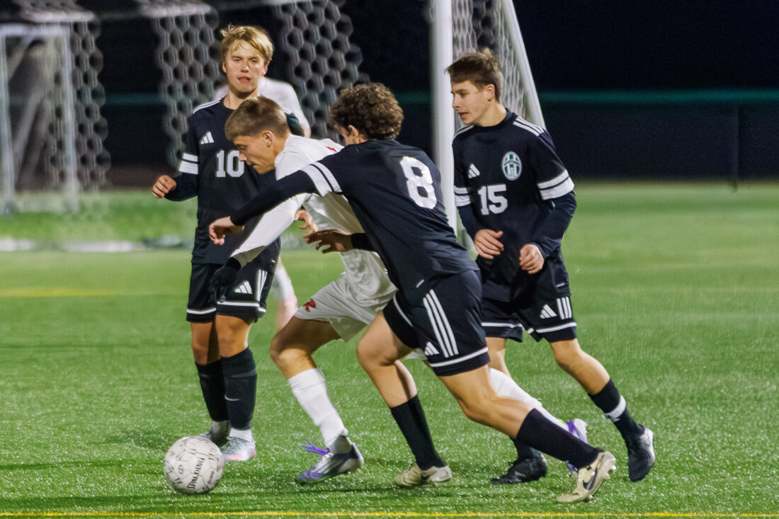 - Allegany-Limestone’s Landon Hayes (8), Cooper Wilczewski (10) and Collin Coleman (15) surround Randolph’s Cooper Freeman during Tuesday’s Section VI Class C semifinal in Allegany. Photo courtesy of Mike Frame