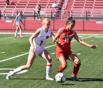 - Jamestown forward Payton Gibbs, left, and Falconer/Cassadaga Valley/Maple Grove defender Madilyn Seastrum battle for the ball during the second half of Saturday’s CCAA Division 1 matchup at Strider Field. P-J photo by Christian Storms