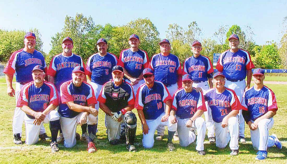 The Jamestown Old Timers defeated Girard 14-9 last Sunday in Warren, Ohio to capture their second consecutive 50-and-older championship. Kneeling, from the left are: Ron Thomas, Brian Ferry, Ted Wyberanec, Jason Ostrom, Miguel Evangelista, Roy Luksch and Chris Yost. Standing are: Nate Welker, Wade Nelson, Glenn Morse, Troy Johnson, Winston Woodard, Doug Frank and Ed Baldensperger.