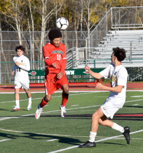 - Jamestown’s Tavion Goodlow heads the ball in front of West Seneca’s Andrew Ross during Monday’s Section VI Class AAA semifinal at Strider Field in Jamestown. P-J photo by Matt Spielman