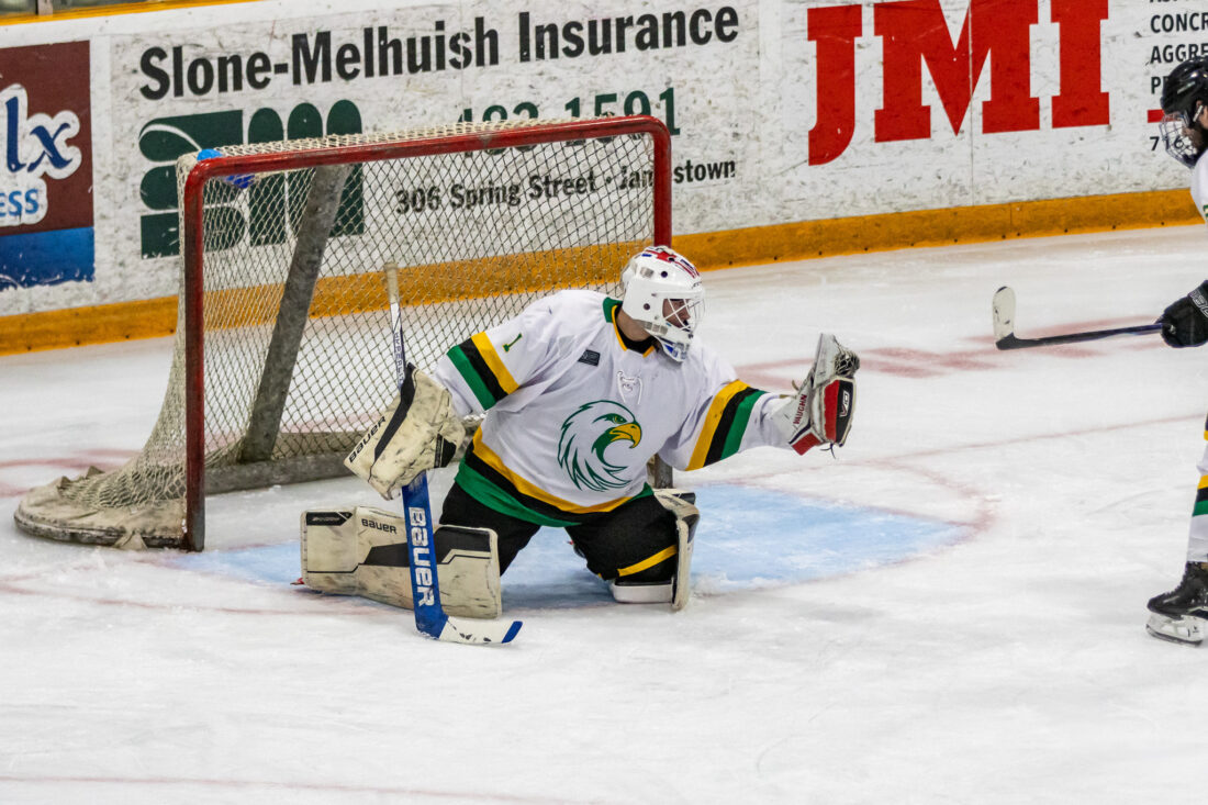 Jamestown Community College goaltender James-Anthony Roch makes a save during the first period against Geneseo on Saturday at Northwest Arena. Photo courtesy of Alex Kolstee