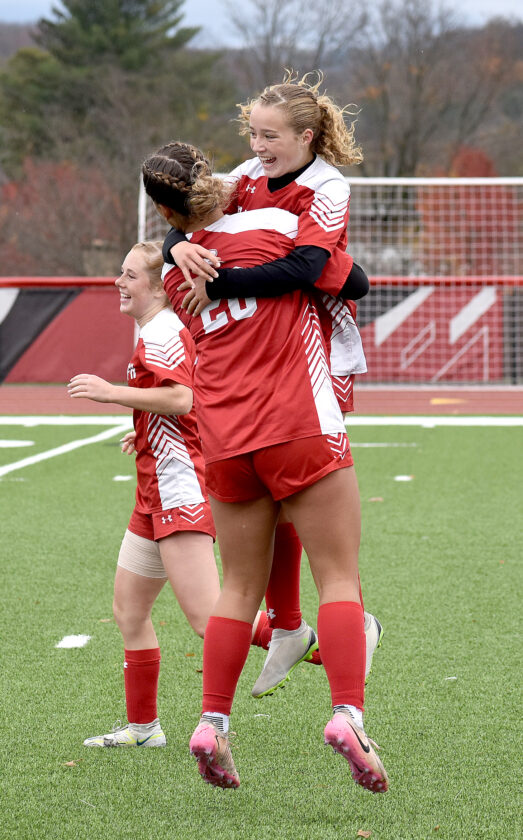 Randolph’s Serena Smith jumps into the arms of Hannah Hill (20) after scoring during the second half of Saturday’s Section VI Class C quarterfinal against Holland at Raymond Van Wie Stadium in Randolph. P-J photo by Matt Spielman