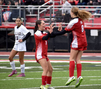 - Randolph’s Gianna Bowles and Ella Monroe celebrate after Bowles scored to open the scoring in Saturday’s Section VI Class C quarterfinal against Holland at Raymond Van Wie Stadium in Randolph. P-J photo by Matt Spielman