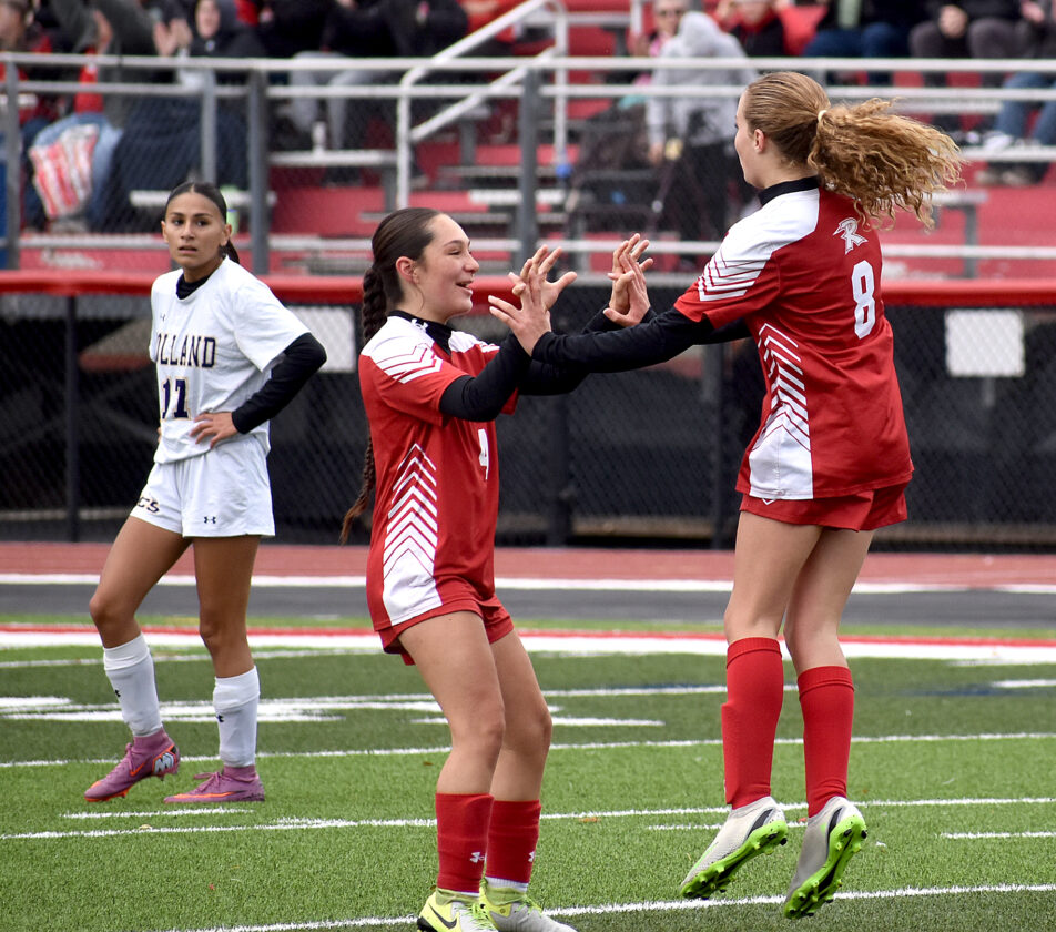 - Randolph’s Serena Smith (8) and Jade Miller (4) celebrate Smith’s first-half goal as Holland’s Angelie Bernal (17) looks on during Saturday’s Section VI Class C quarterfinal at Raymond Van Wie Stadium in Randolph. P-J photo by Matt Spielman