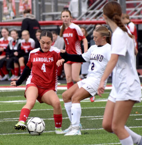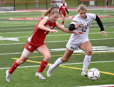 - Randolph’s Ava Sears attempts to get by Holland’s Charlotte Rak during the first half of Saturday’s Section VI Class C quarterfinal at Raymond Van Wie Stadium in Randolph. P-J photo by Matt Spielman