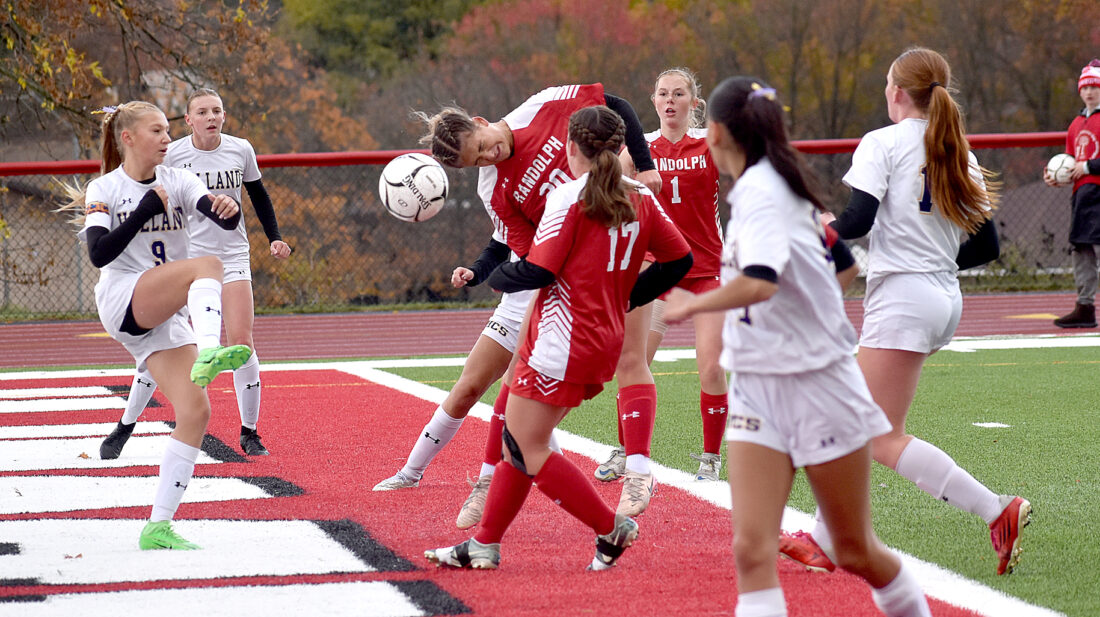 Randolph’s Hannah Hill gets a head on a corner kick during the first half of Saturday’s Section VI Class C quarterfinal against Holland at Raymond Van Wie Stadium in Randolph. P-J photo by Matt Spielman