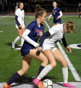 - Southwestern’s Olivia Goeckel (22) and Falconer/Cassadaga Valley/Maple Grove’s Kylie Kress (13) attempt to settle a ball along the sideline during Tuesday’s Section VI Class B semifinal at the Fran Sirianni Athletic Complex in West Ellicott. P-J photo by Matt Spielman
