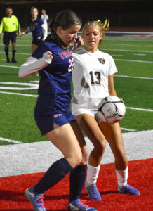 - The Trojans’ Mikaela Luce (13) and Golden Cougars’ Sydnee Snow battle for possession. P-J photo by Matt Spielman