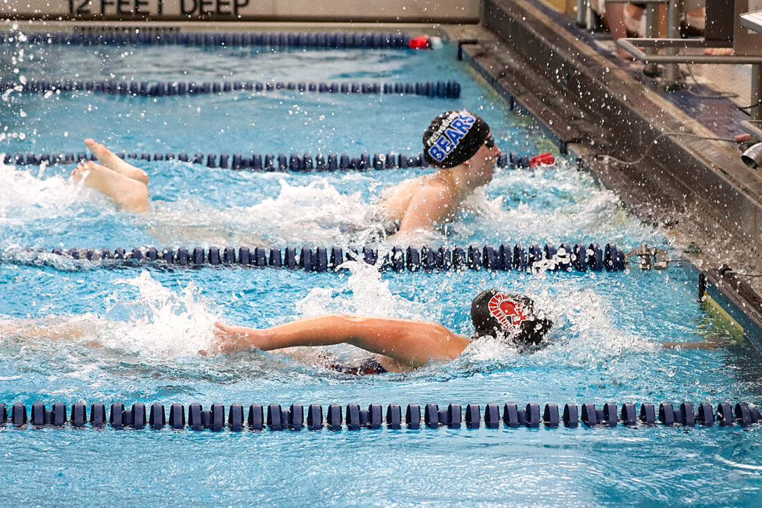 - Frewsburg/Falconer’s Mickey Hartley just beats Southwestern/Jamestown’s Gabriella Bango to the finish line in the 200-yard freestyle relay during Tuesday’s CCAA meet at Southwestern Elementary School. Photo courtesy of Shelly Phillips