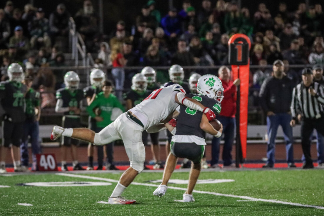 Southwestern/Frewsburg’s Zach Markham wraps up Wolfpack quarterback Carson White during Class C South football action on Charles A. Lawson Field at the Sirianni Athletic Complex on Friday. Photo courtesy of Shelly Phillips