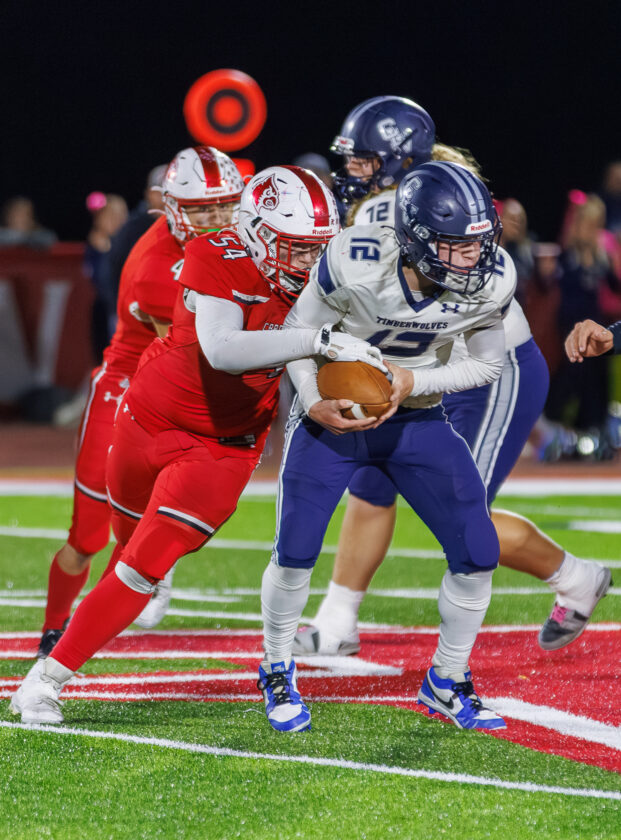 Randolph’s Hunter Foster brings down Cattaraugus-Little Valley’s Tucker Barrick during last Friday’s Class D football game in Randolph. Photo courtesy of Mike Frame