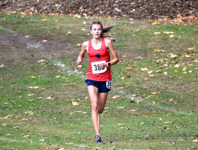 Jamestown’s London Hamilton chases down the leaders during the girls race at the CCAA Championships on Friday at Bemus Point Golf Course. P-J photo by Matt Spielman