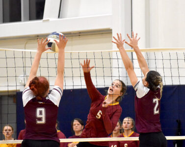 Clymer’s Finley Mitchell spikes the ball over the net while Ellicottville’s Keira Baldwin (9) and Ande Northrup (2) attempt a block during Thursday’s Section VI Class D final at Southwestern High School. P-J photo by Christian Storms