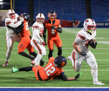- Jamestown’s Nate Sanchez is taken down by Bennett’s Acari Brown during the Section VI Class AA championship game at Highmark Stadium in Orchard Park on Friday evening. Photo courtesy of Jeremy McKoy | F.A.M. Photography