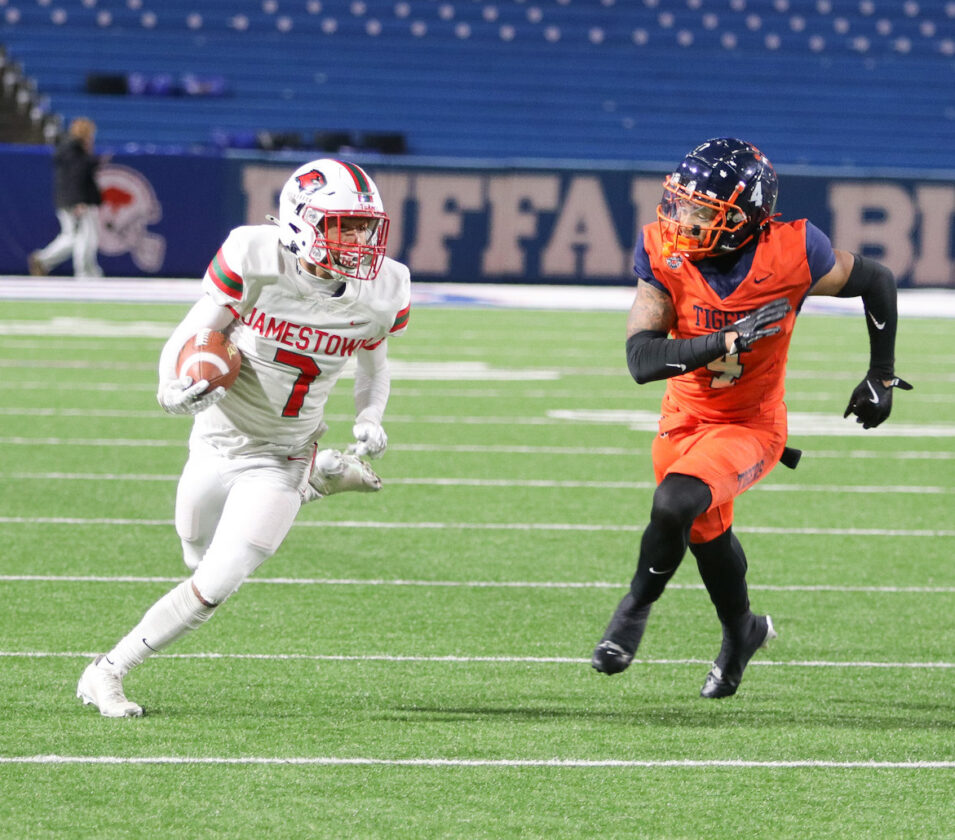 - Jamestown’s Chase Bonta breaks into the end zone for a touchdown against Bennett in the Section VI Class AA championship game at Highmark Stadium in Orchard Park on Friday evening. Photo courtesy of Jeremy McKoy | F.A.M. Photography