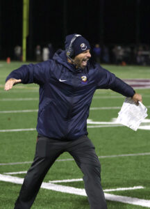 Chautauqua Lake/Westfield/Brocton head coach Ty Harper celebrates during Friday’s Class C football semifinal against Barker/Royalton-Hartland. Photo courtesy of Cody Jacobson