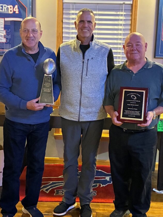 The Southwestern Chapter of NYS Association of Certified Football Officials recently held its postseason banquet at the South Dayton Hotel. Honored, from the left, are Vince Joy Jr., for his 50 years of officiating excellence and service to the chapter; Scott VanStee, chapter president; and Barney Lee, the recipient of the “Roger Mason Award” for his outstanding leadership and dedication to the chapter. Anyone interested in becoming a certified high school football official should contact Joy at vjjr1956@yahoo.com.