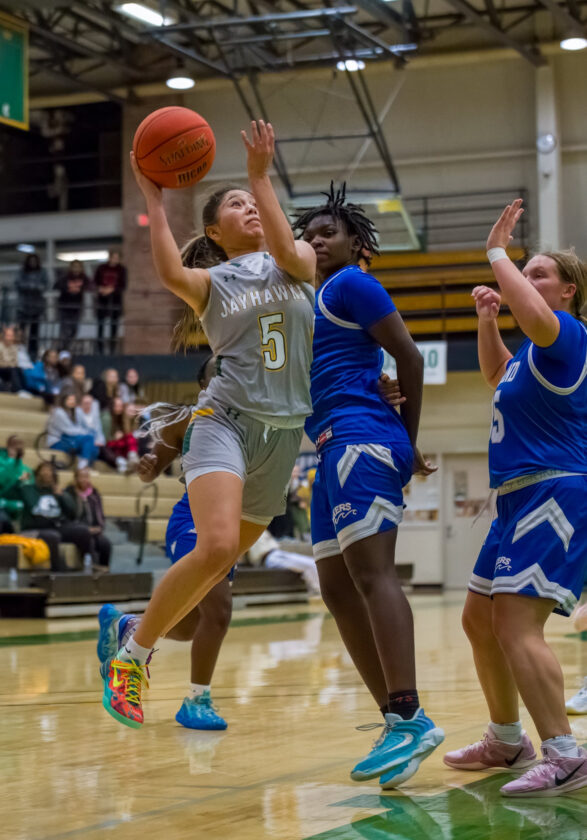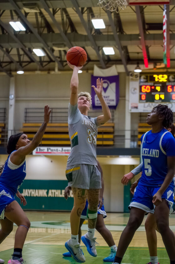 The Lady Jayhawks’ Kendra Altadonna shoots between a pair of Lakeland CC defenders. P-J photo by Jason Bower