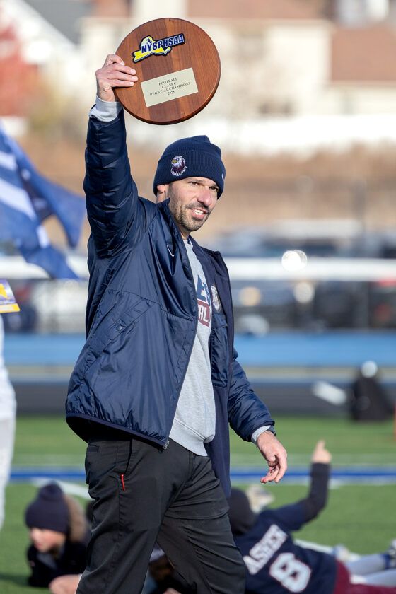 Chautauqua Lake/Westfield/Brocton head coach Ty Harper holds up the plaque after winning Saturday’s NYSPHSAA Class C Far West Regional over Alexander/Pembroke at Robert Rich Sr. All High Stadium in Buffalo. Photo courtesy of Cody Jacobson