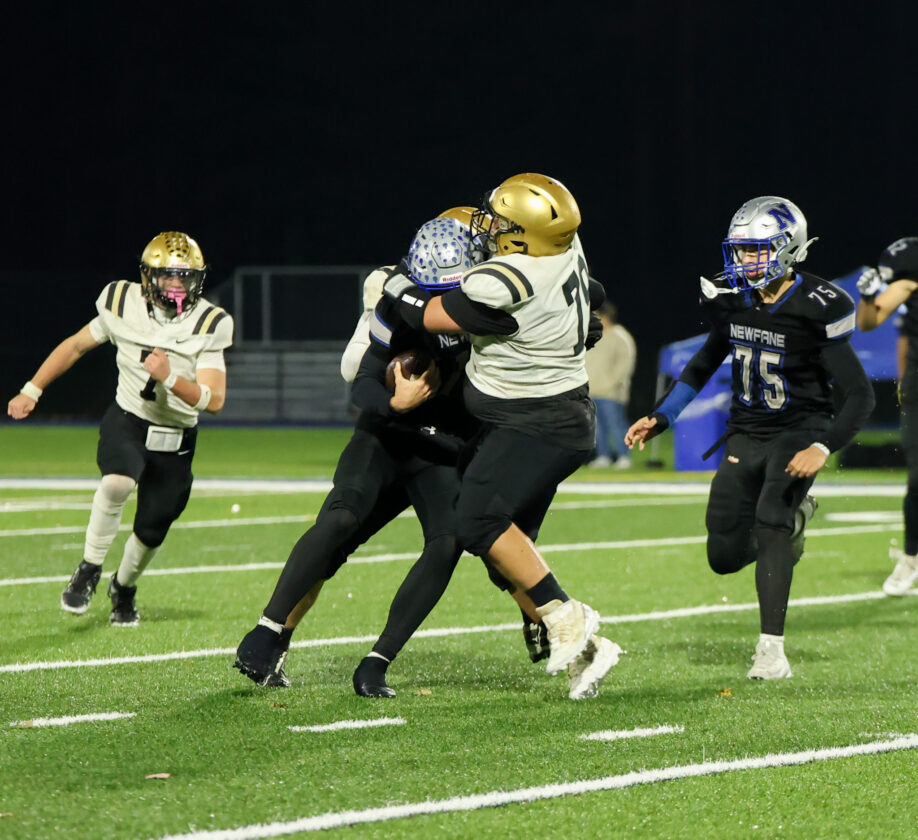 Silver Creek/Forestville’s Vince Prinzbach brings down Newfane quarterback Mac Capen for a sack during the Section VI Class D football semifinals Friday night. P-J photo by Jon Neubauer | Sideline Images of WNY