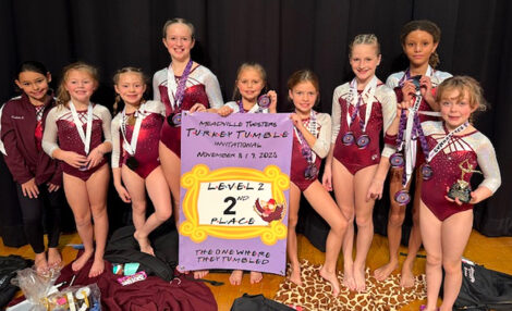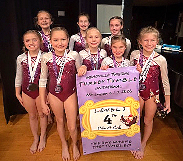 - The Lakewood Starz Gymnastics Level 3 team took fourth at the Turkey Tumble Invitational hosted by the Meadville Twisters in Saegertown, Pa. Pictured, from left, are: Kaylee Couse, Emilie Roush, Abigail Erickson, Emaline Olson, Cora Thayer, Aubrey Irons, Cora Caldwell and Hanna Clark. Submitted photo