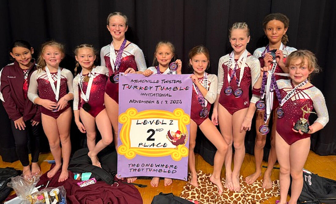 - The Lakewood Starz Gymnastics Level 2 team took second at the Turkey Tumble Invitational hosted by the Meadville Twisters in Saegertown, Pa. Pictured, from left, are: Isabella Olson, Harper Ross, Lydia Clark, Sophea Ferguson, Emma Anderson, Izzy Raynor, Allison Froman, Aubrey Green and Jacqueline O’Brian. Submitted photo