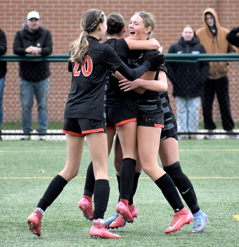 - Wilson goal scorer Zoe Beck celebrates with teammates Addison Elia, Keira Croisdale (20) and Colbie Elia (hidden) during Saturday’s Section VI Class C final against Frewsburg at Allegany-Limestone Middle-High School. P-J photo by Matt Spielman