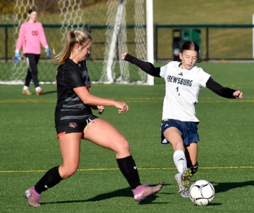 - Frewsburg’s Charlie Lombardo (1) sends the ball away from Wilson’s Grace Smith during Saturday’s Section VI Class C final at Allegany-Limestone Middle-High School. P-J photo by Matt Spielman