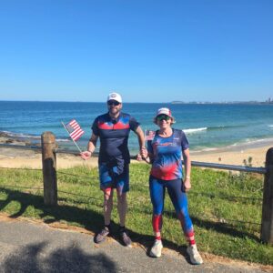 Robert Aucoin and Mindy Lawson-Crabtree pose with American flags with the Tasmanian Sea in the background at the 2025 World Triathlon Championships in Wollongong, Australia. Submitted photo