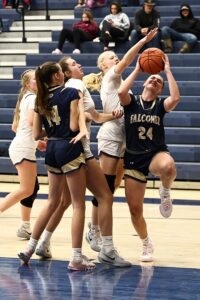 - Chautauqua Lake’s Addison Chess defends Falconer’s Ellyson Baglia (24) under the basket during nonleague action in Mayville on Monday. Photo courtesy of Steve Garvey