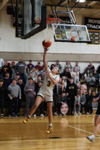 Spectators at the Forestville gym looks on with anticipation as Carilene Sliwa drives for a layup to become the third girl in school history to reach 1,000 career points on Tuesday night against Chautauqua Lake in nonleague action. P-J photo by Jon Neubauer