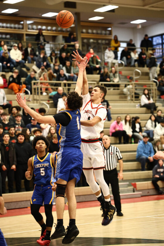 - Jamestown’s Gavin Johnson lays a shot over Lockport’s Lennox Carter during a nonleague boys basketball game at McElrath Gymnasium on Saturday. Photo courtesy of Steve Garvey