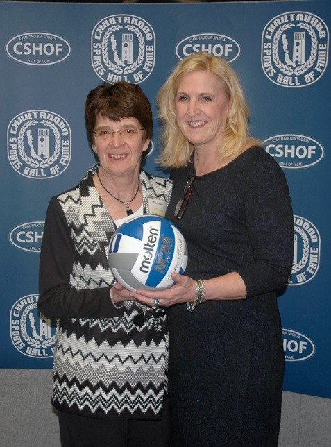 In this February 2017 file photo, Deb Palmer, left, and Jolene Nagel pose for a photo at the Chautauqua Sports Hall of Fame banquet. Nagel, who announced her retirement as the Duke volleyball head coach earlier this week, was a volleyball player for Palmer at Panama Central School in the 1970s. Both are CSHOF inductees. Photo courtesy of the Chautauqua Sports Hall of Fame