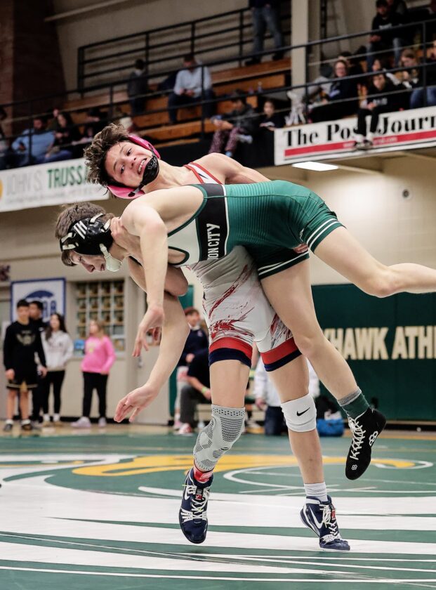 Southwestern senior Adrian Torres lifts Union City (Pa.) senior Van Ward during the 110-pound third-place match at the STWOA Holiday Classic on Saturday at Jamestown Community College’s Physical Education Complex. Photo courtesy of Michelle Gilmour