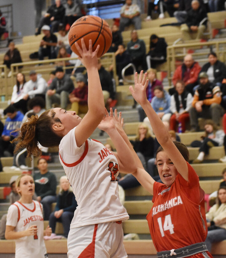- Jamestown’s Payton Gibbs drives to the basket while being defended by Salamanca’s Addison Earley during the Roger Weiss Showcase on Saturday at McElrath Gymnasium in Jamestown. P-J photo by Scott Kindberg
