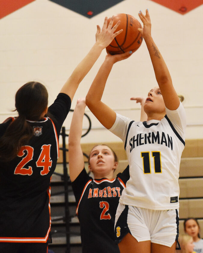 Sherman’s Emmersen Crawford puts up a shot in the lane while being defended by Amherst’s Lucy Giordano (24) and Ada Radomski during the Roger Weiss Showcase on Saturday at McElrath Gymnasium in Jamestown. P-J photo by Scott Kindberg