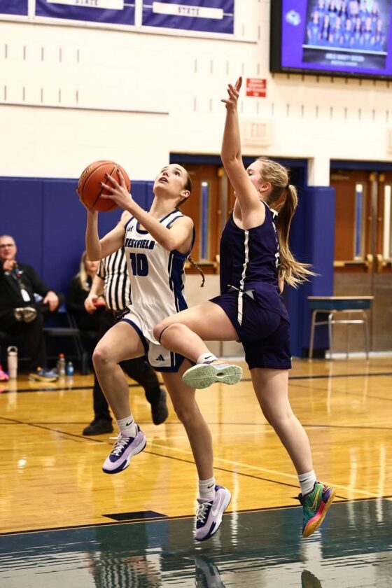 - Westfield’s Sophia Wolfe sets her sights on the basket while being guarded by Pine Valley’s Sandy Ivett in nonleague girls basketball action Monday night. Photo courtesy of Steve Garvey