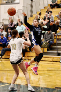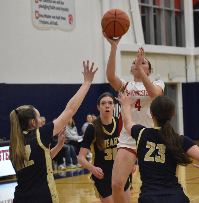 - Southwestern’s Marlana Cresanti shoots ahead of two Frewsburg defenders in nonleague action. P-J photo by Scott Kindberg