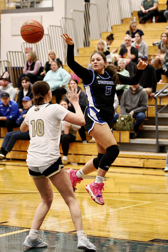 - Westfield’s Arielle Corbett sends a pass past Falconer’s Sydnee Snow during the first round of the Westfield Winter Classic on Monday. Photo courtesy of Steve Garvey