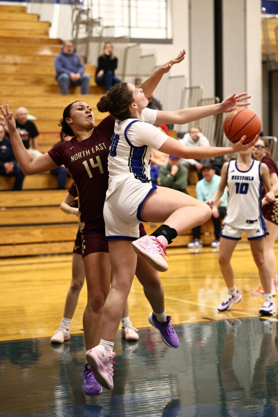 - Westfield’s Reagan Weingart attempts a layup while being defended by North East’s Jalyssa Wicker in the championship game of the Westfield Winter Classic on Tuesday. Photo courtesy of Steve Garvey