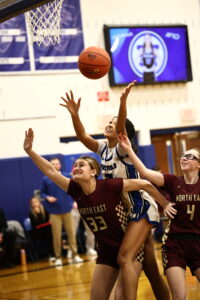 Westfield’s Reagan Weingart attempts a layup while being defended by North East’s Jalyssa Wicker in the championship game of the Westfield Winter Classic on Tuesday. Photo courtesy of Steve Garvey