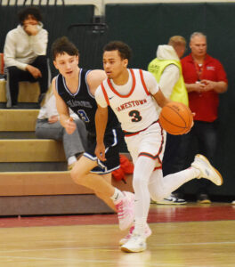 - Jamestown’s Jericho Thagard dribbles the ball up the court during Monday’s ECIC Division 1 boys basketball game against Frontier at McElrath Gymnasium in Jamestown. P-J photo by Scott Kindberg