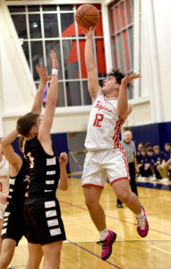 Southwestern’s Roger Markham goes up for a shot over Fredonia’s Graham Putney during Chautauqua-Cattaraugus Athletic Association Division 1 boys basketball action Monday in West Ellicott. P-J photo by Matt Spielman