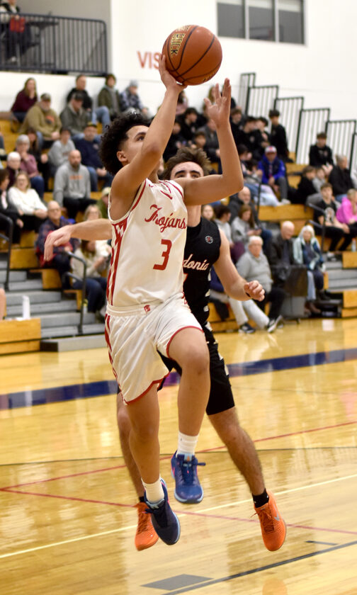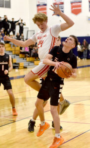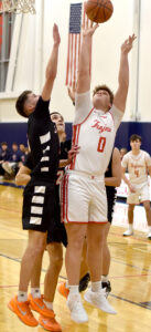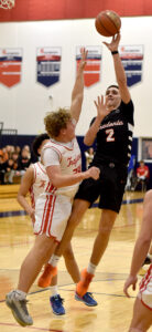 - Southwestern’s Roger Markham goes up for a shot over Fredonia’s Graham Putney during Chautauqua-Cattaraugus Athletic Association Division 1 boys basketball action Monday in West Ellicott. P-J photo by Matt Spielman