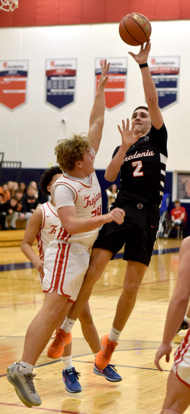 - Fredonia’s Donovan Dowdy floats a shot over Southwestern’s Carter Casselman during CCAA Division 1 action on Monday in West Ellicott. P-J photo by Matt Spielman
